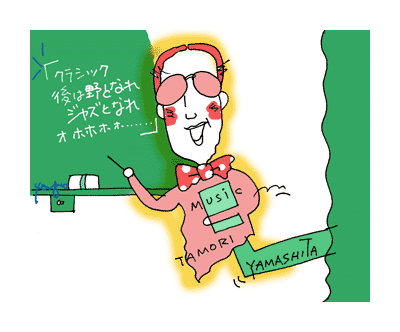 | 「音楽テーマ事典」をご存知だろうか。メロディは覚えているけど誰の何という曲だっけ、というときに利用する。ただしこれすべての人に、「移動ド音感」があるという前提のもとに出来ている。たとえば「運命」の出だしは「ミミミド」か「EEEC」で探す。移動ドの実用性をよく示す例だ。これ、絶対音感の人も使用可能なのか知りたくなる。事典は今のところクラシック曲ばかりだが、ジャズで同じものが出来たら面白い。「ソソソソソソソソソソソソソ」すぐ分かるワンノート・サンバ。 9月30日 京都。今日から3日間、ライブスポット「RAG」の20周年特別興行の一環。初日はソロ・プラス吉田美奈子。久々に美奈子節を堪能。楽屋にオーナーの須田さんの娘アサヒ六歳が登場。音楽に興奮したのか、習っている日本舞踊「證誠寺の狸囃子」を披露し、ステージの絵を描いてくれ、やがて美奈子さんの巨大な髪の毛をいじり回し、体に体を巻き付け、とうとうその中にもぐり込んで住んでしまった。動物と子供には特別の波長回路があるという美奈子さんには当然の出来事らしい。 二日目は「4Gユニット」竹内直(ts, bcl)、水谷浩章(b)高橋信之介(ds)。4Gの意味は四つのジェネレーションで、2,3,4,5となっている。最年少は23歳になったばかりの信之介、最年長はおれだが、近々一つ増えるので、きれいな数字の流れが乱れて悲しい。打ち上げはこちらは途中でくたばったが、メンバーでは案の定、朝までの最長不倒距離が出た。相変わらず元気な水谷君だ。 三日目は茂木大輔(ob)と金子飛鳥(vn)のトリオ。お二人には来年正月11日に初台の東京オペラシティ・コンサートホールでやる「超室内楽」コンサートのメンバーになってもらっているので、予告を兼ねて暴れてもらった。茂木さんには自身の木管五重奏を率いて参加してもらうので、各楽器の特性など質問しまくる。彼は「オーケストラ人間的楽器学」というオケを使った素晴らしいプロジェクトを続けていて、去年の大晦日には、若手指揮者としてのデビューも果たした。 10月6日 宮崎県の木城。山の中にある「えほんの郷」で、毎年一度金子飛鳥が野外コンサートをやっている。織姫と彦星のコンセプトなのだが、なぜか毎年違う男を連れて来る結果になる。ここはおれも以前から縁があって、1月の寒空に山のてっぺんで野ウサギに聴かせるという趣旨のもとに、仙波清彦(perc)とデュオをやったこともある。もっともこれがヒントになって後に絵本「つきよのおんがくかい」ができるので首謀者の黒木郁朝さんには感謝しなければならない。 「えほんの郷」の館長の黒木さんは夏には子供の合宿塾もやっていて、そこでは「親に言わない秘密をもて」などと教える。釣りも大事で、魚を強くつかむと死ぬが弱すぎると逃げる、身体で分かるその感触を知らない子供が増えるので、色々問題が起きるという。夜、野外の水の上のステージに左右の花道から出てデュオを奏でる。飛鳥さんのバイオリンの音が山々に沁み、やがて見事な月が誘い出された。 10月10日 日吉の慶応大学でジャズ入門講座。在校生、学外の社会人の方々などが聴講。首謀者はベルリン留学中におれのコンサートにも来てくれたという独文学者の斎藤太郎先生。紹介者の仏文学者荻野アンナ先生も顔を出してくれる。横浜での美術祭で手に入れたという、文字盤に「遅れるな!」と書いてある腕時計を見せてくれる。それを指して「私グズ、これグッズ」と早くもアンナ・ダジャレ全開。これを言うために手に入れたに違いない。 講座の内容は、「教養講座“日本ジャズ界の変遷”」という昔のレコードをかけてから始める。最近あらためて聴く機会があって、導入部として実に適当であることを発見した。この中洲産業大学芸術学部器楽科のタモリ教授は、クラシックが専門なのだが、ジャズに造詣も深く連続講座をラジオで持っている。ジャズのアフリカ起源、ブルーノートについての言及(「ワークソング」からブルーノートを取り去ると沖縄民謡になってしまうという驚くべき指摘もある!)、ジャズマンの反対言葉に潜む法則性、「アベサダとジャズ」「山下のスポーツ・ジャズ」などなどを、タモリ教授は歌とピアノの実演を交えて行う。最後には「どうせたかが民族音楽のことで、ジャズがどうなろうと、クラシック専門の私などは、どうでもよろしいのですが、おほほほほほ ・・」などと甲高い声を出して、キザ教授の本性が現れる。 このレコードをかけ、タモリ教授のご意見をたたき台にして、そこに別の解釈を加えたり、もっと詳しく説明したりすると、非常にスムーズにトーク・ショウが出来ることを発見したのだ。無事終わり、先生達と会食。斎藤先生が横浜ベイスターズ・ファンと知って盛り上がる。来年、谷繁が残っててくれるように祈りつつ、帰途についた。 「CDジャーナル」2001年12月号掲載 |